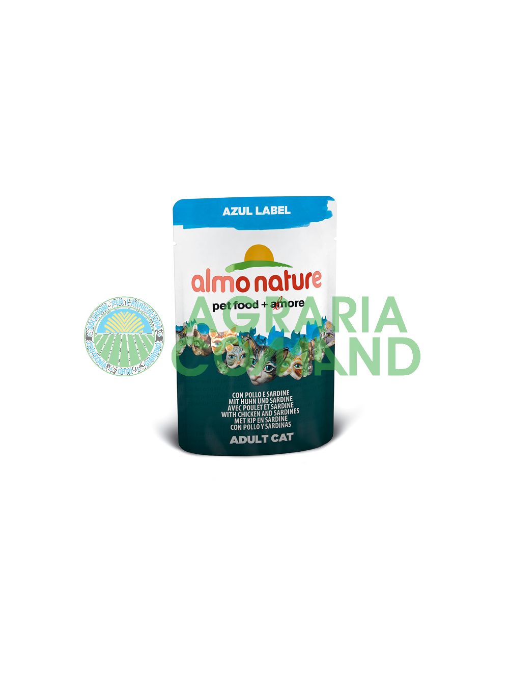 Comida húmeda para gatos. Las recetas de Almo Nature Azul Label se componen de ingredientes de alta calidad sólo aptos para la alimentación de animales de compañía .La gama Azul Label ofrece comida húmeda y snacks.
