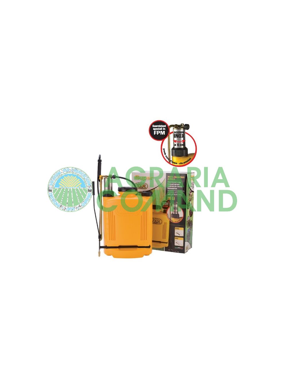 Capacidad lt.20 - 60 mm bomba inox ext. Presión 6 bar. Se suministra con manguera de 1,5 m y lanza con pulverizador regulable.