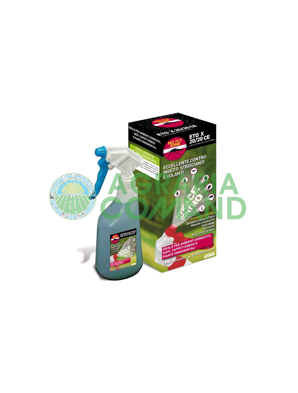 Características: sistema de suministro de insecticida con gatillo para uso doméstico, civil y profesional con efecto rápido y larga acción residual. Actúa por contacto o ingestión, conserva las características y potencia de los piretroides con un perfil ecológico mejorado. ETO X 20/20 CE tiene la característica de ser eficaz contra un amplio espectro de insectos, tanto voladores como rastreros. Gracias a los cartuchos predosificados, puede utilizarse con total seguridad reutilizando la misma botella de 0,5 L.